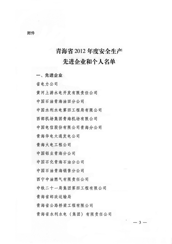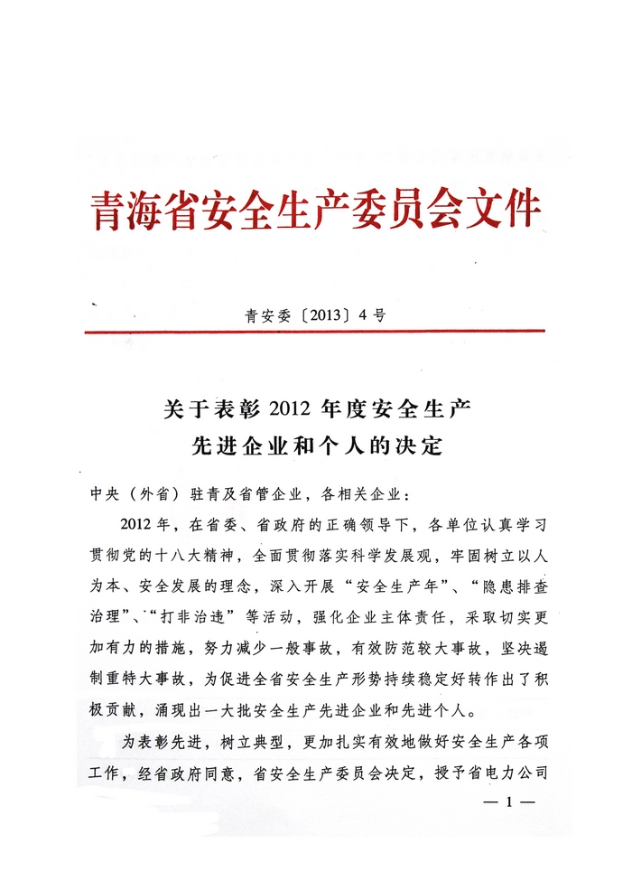 2012年,在省委、省政府的正確領(lǐng)導下,青海省物產(chǎn)集團總公司認真學習貫徹黨的十八大精神,全面貫徹落實科學發(fā)展觀,牢固樹立以人為本、安全發(fā)展的理念,深入開展"安全生產(chǎn)年"、"隱患排查治理"、"打非治違"等活動,為促進全省安全生產(chǎn)形勢持續(xù)穩(wěn)定好轉(zhuǎn)做出了積極貢獻。為此,經(jīng)省政府同意,省安全生產(chǎn)委員會決定授予青海省物產(chǎn)集團總公司"2012年度安全生產(chǎn)先進企業(yè)"榮譽稱號。